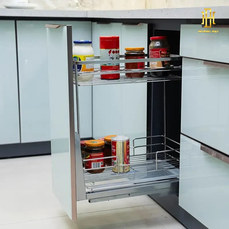 Không thể không nhắc đến hệ thống ray âm giảm chấn – một tính năng quan trọng giúp giá gia vị vận hành một cách mượt mà, êm ái. Với cơ chế giảm chấn, sản phẩm không gây tiếng ồn lớn khi đóng mở và tránh được những va đập mạnh có thể làm đổ các lọ gia vị. Điều này mang lại sự thoải mái và tiện lợi tối đa trong quá trình sử dụng, đặc biệt là khi bạn cần thao tác nhanh chóng trong không gian bếp.