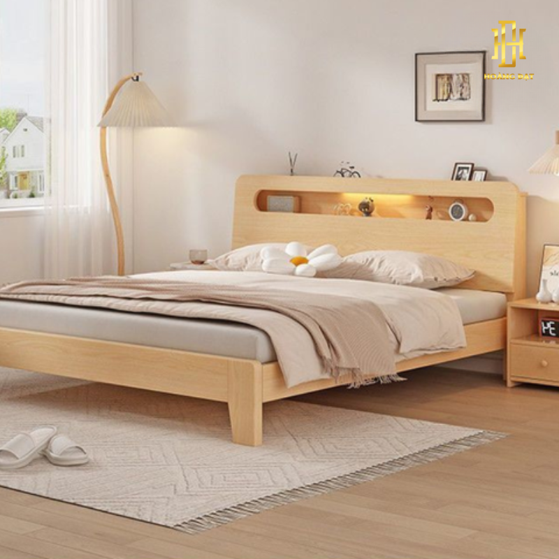 Chiếc giường ngủ gỗ sáng mang đến cảm giác ấm áp và hiện đại cho không gian phòng ngủ. Thiết kế đầu giường thông minh với kệ trang trí tiện lợi, giúp bạn có thêm không gian đặt sách, đồng hồ hay vật dụng nhỏ xinh. Tông màu gỗ tự nhiên kết hợp ánh đèn nhẹ nhàng tạo nên bầu không khí thư giãn, dễ chịu. Ngoài ra, phần hộc kéo bên dưới giường giúp tối ưu diện tích, giữ cho căn phòng luôn gọn gàng và tinh tế.