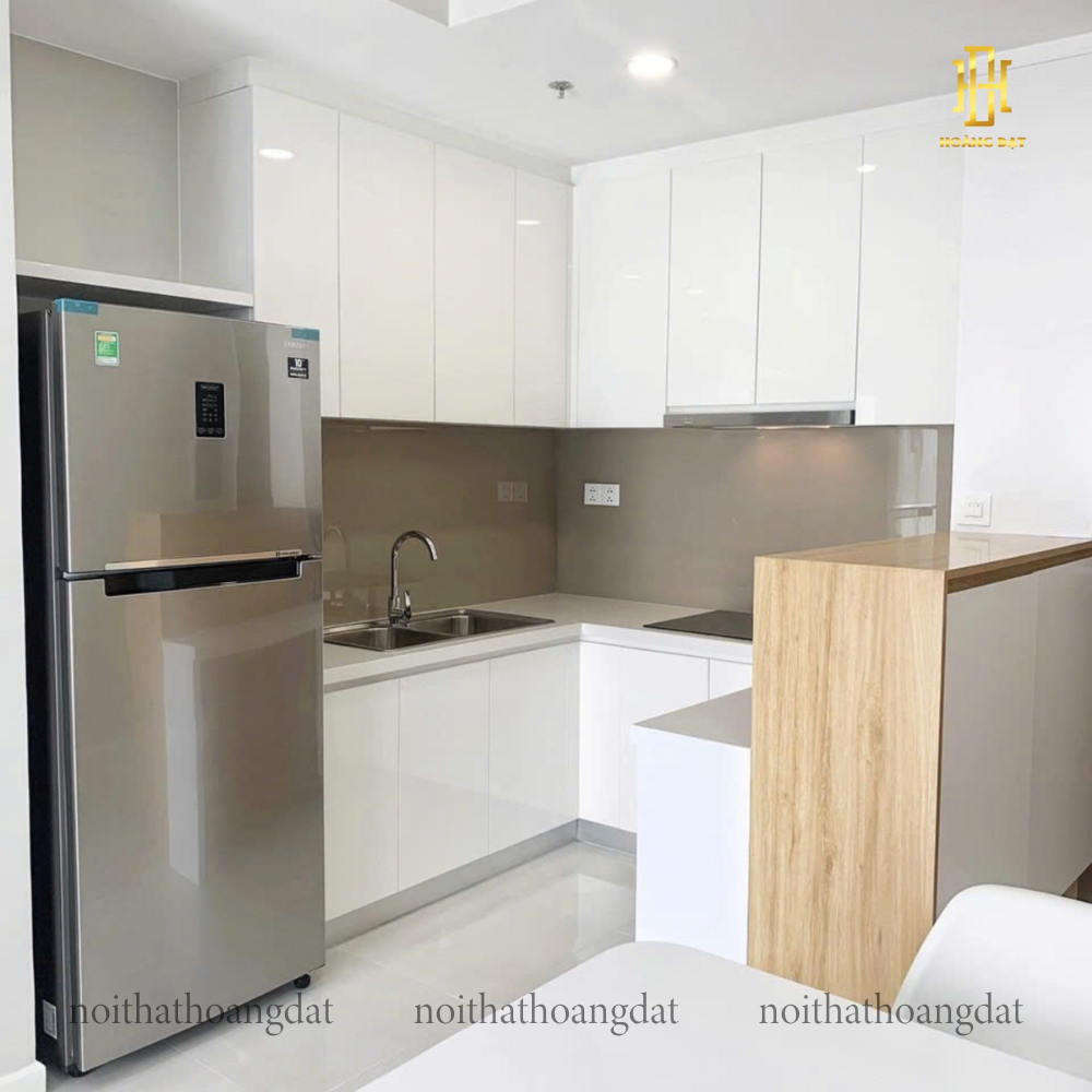 Phòng bếp chung cư hiện đại chữ L thông minh với hệ tủ trên – tủ dưới màu trắng bóng mang lại cảm giác sạch sẽ, tươi sáng và thoáng đãng cho không gian bếp. Tủ lạnh, bếp từ, máy hút mùi và bồn rửa chén được bố trí hợp lý, đảm bảo hiệu suất sử dụng trong không gian nhỏ.
