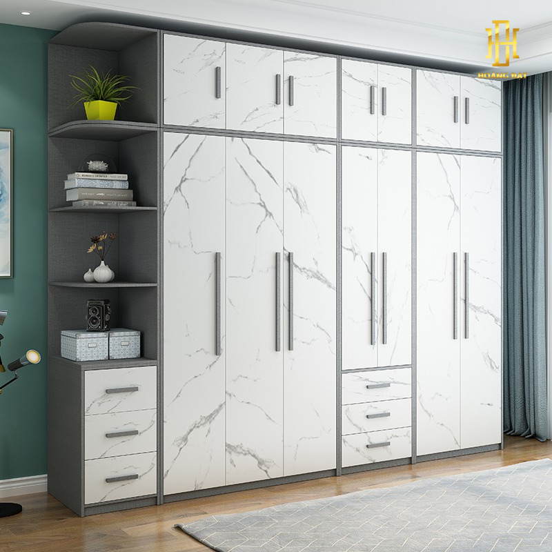 Tủ quần áo vân đá trắng mang nét sang trọng và tinh tế, là lựa chọn hoàn hảo cho không gian hiện đại. Thiết kế cao kịch trần giúp tối ưu diện tích lưu trữ, kết hợp hài hòa giữa tone trắng marble và khung viền xám tạo điểm nhấn tinh tế. Từng chi tiết tay nắm dài, đường vân đá tự nhiên đều toát lên vẻ thanh lịch, giúp căn phòng trở nên sáng sủa, đẳng cấp và đầy tính thẩm mỹ.