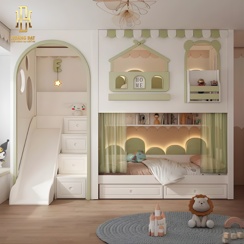 Hệ giường tầng được thiết kế theo phong cách hiện đại – bo tròn an toàn, tạo nên không gian vừa là phòng ngủ, vừa là khu vui chơi sáng tạo cho trẻ.