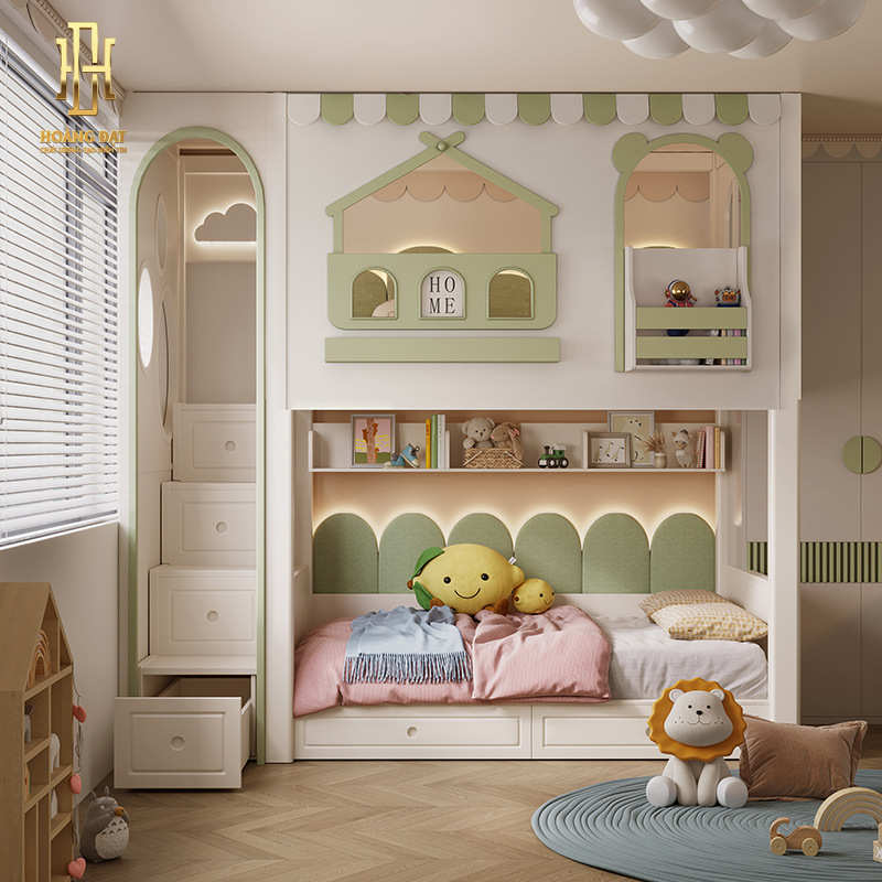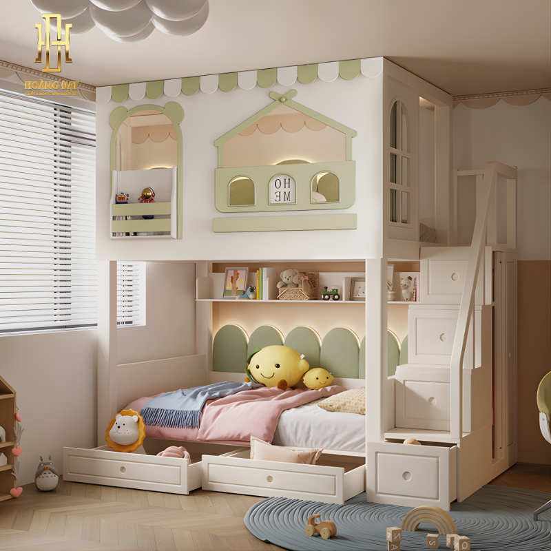 Khu vực cầu thang liền hộc tủ được thiết kế chắc chắn, từng bậc có ngăn kéo giúp tăng không gian lưu trữ và hỗ trợ bé lên xuống dễ dàng. Gam màu pastel nhẹ nhàng kết hợp các chi tiết bo cong tạo cảm giác ấm áp, thân thiện và phù hợp với nhiều độ tuổi.