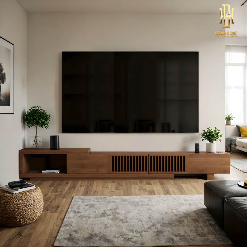 Sản phẩm sử dụng gỗ công nghiệp cao cấp phủ vân gỗ tự nhiên sắc nét. Bề mặt được xử lý nhẵn mịn, hạn chế trầy xước và dễ lau chùi. Cốt gỗ chắc, chịu lực tốt khi đặt tivi và thiết bị điện tử. Độ hoàn thiện cao thể hiện rõ ở từng chi tiết ghép nối.