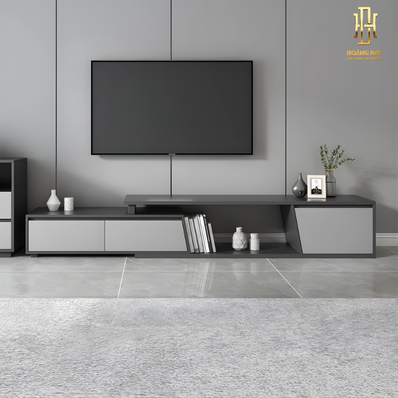 Kệ tivi gỗ công nghiệp cao cấp Hoàng Đạt – TV022 sở hữu thiết kế mở rộng linh hoạt, phù hợp nhiều không gian phòng khách hiện đại. Kết cấu dạng module cho phép người dùng kéo dài hoặc thu gọn tùy nhu cầu sử dụng thực tế. Tổng thể kệ thấp, trải ngang, tạo cảm giác căn phòng thoáng và rộng hơn. Mẫu kệ đáp ứng được hết tất cả các dòng tivi treo tường kích thước lớn.