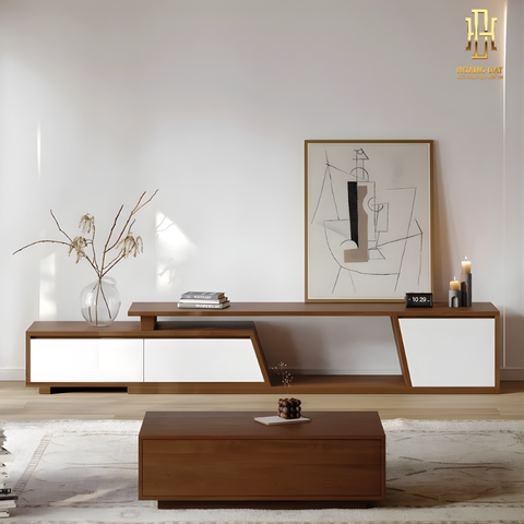 TV022 có hệ ngăn kéo kín kết hợp khoang mở bố trí lệch tạo điểm nhấn thị giác rõ ràng. Cấu trúc trượt linh hoạt cho phép mở rộng toàn phần hoặc một phần tùy nhu cầu. Không gian lưu trữ được phân chia khoa học, phù hợp đặt đầu thu, sách hoặc phụ kiện. Thiết kế này giữ mặt kệ luôn gọn gàng và tinh tế.