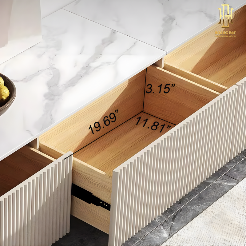 TV024 được thiết kế hệ ngăn kéo rộng, chia khoang khoa học bên trong. Cánh tủ dạng sọc dọc tạo chiều sâu thị giác và tăng tính thẩm mỹ. Ngăn kéo vận hành êm, thao tác nhẹ tay khi đóng mở. Không gian lưu trữ phù hợp thiết bị điện tử và đồ dùng phòng khách.