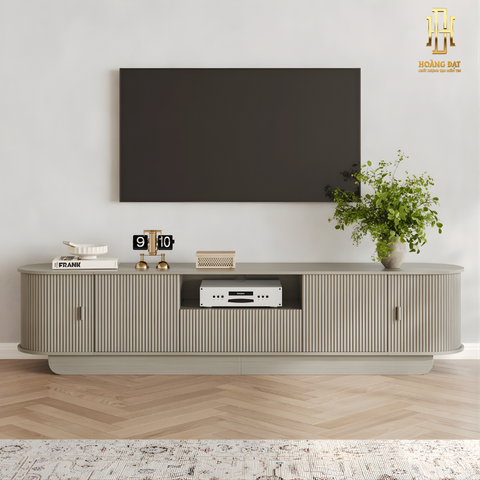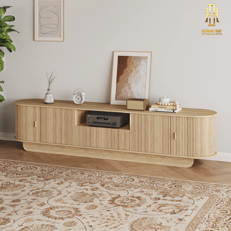Kệ tivi gỗ công nghiệp cao cấp Hoàng Đạt - TV026 gây ấn tượng với thiết kế bo cong mềm mại ở hai đầu, tạo cảm giác liền mạch và tinh tế cho không gian phòng khách. Kiểu dáng thấp, trải dài giúp tổng thể cân đối khi treo tivi màn hình lớn. Các đường nét được xử lý gọn gàng, hạn chế chi tiết thừa. Phong cách hiện đại pha chút tối giản, phù hợp nhiều kiểu nội thất.