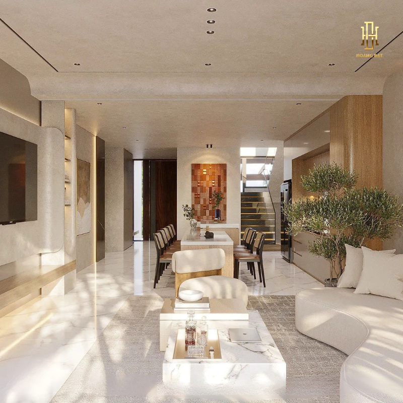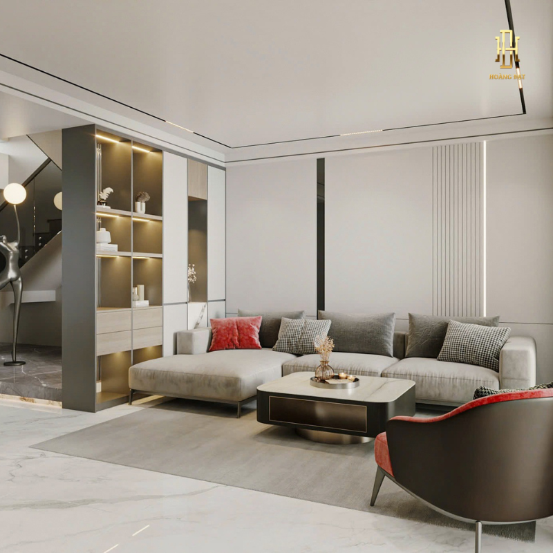 Phòng khách Thiết kế nội thất biệt thự Hoàng Đạt – TKBT005 mang phong cách hiện đại sang trọng với đường nét tinh gọn và bố cục mở thoáng đãng. Bộ sofa lớn phối màu trung tính kết hợp bàn trà đá marble và đèn chùm cao cấp tạo nên không gian đẳng cấp, ấm cúng. Chất liệu gỗ tự nhiên cùng ánh sáng tự nhiên được khai thác tối đa, giúp căn phòng vừa thanh lịch vừa thể hiện gu thẩm mỹ sang trọng của gia chủ.
