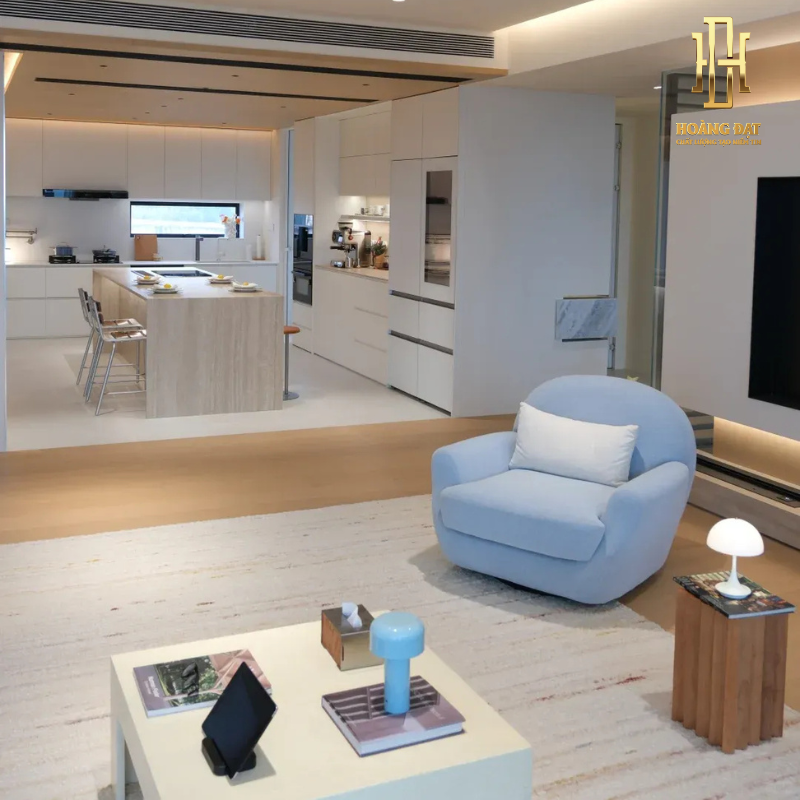 Không gian phòng khách và bếp được thiết kế theo dạng mở, giúp căn hộ trở nên rộng rãi và thoáng hơn. Cách bố trí này tạo sự kết nối liền mạch giữa các khu vực sinh hoạt chung. Gia chủ có thể vừa nấu nướng vừa dễ dàng quan sát và trò chuyện cùng các thành viên trong gia đình.