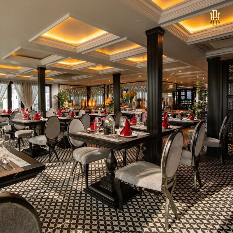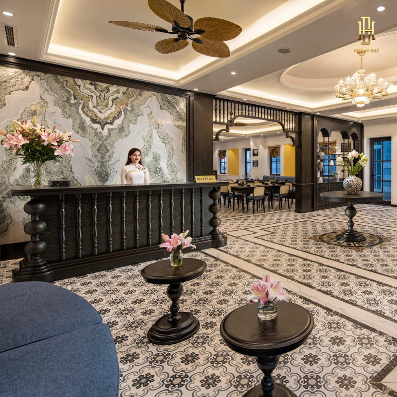 Sảnh Thiết kế nội thất khách sạn Hoàng Đạt – TKKS001 được tạo nên với phong cách sang trọng và hiện đại, là không gian đầu tiên gây ấn tượng mạnh với du khách. Trần cao kết hợp đèn chùm tinh tế, sàn đá marble sáng bóng cùng quầy lễ tân ốp gỗ và kim loại ánh đồng mang đến cảm giác đẳng cấp, tinh tế. Gam màu trang nhã, ánh sáng ấm áp cùng cách bố trí nội thất khoa học giúp sảnh vừa sang trọng, vừa gần gũi thể hiện trọn vẹn tinh thần hiếu khách và phong cách đặc trưng của Hoàng Đạt.