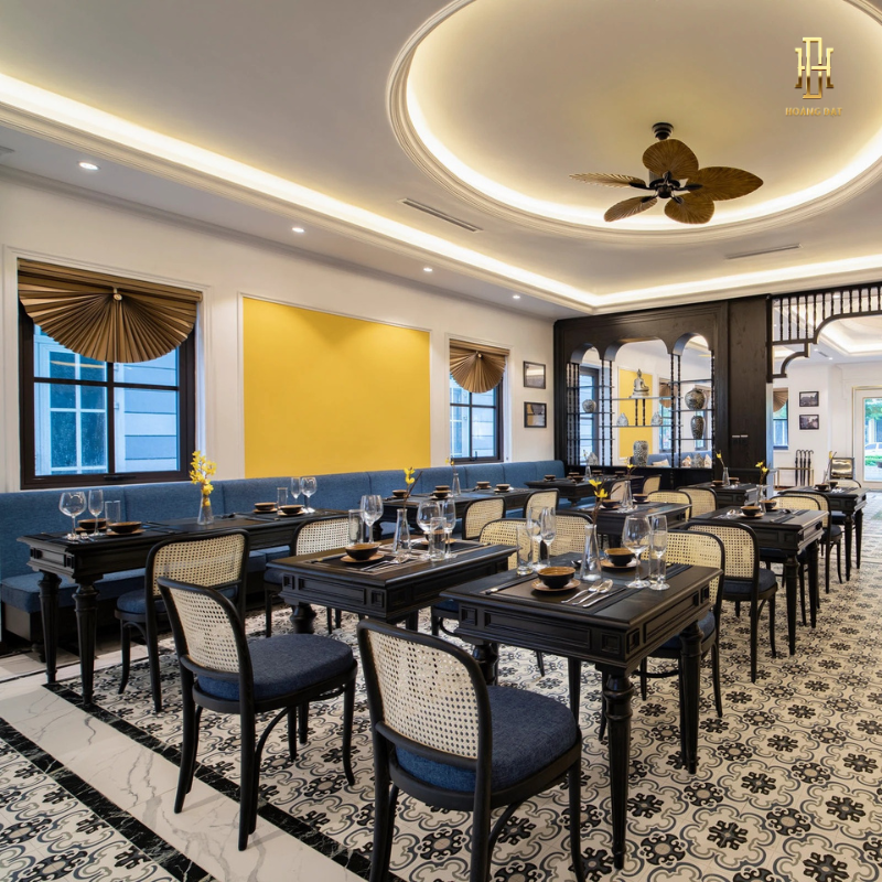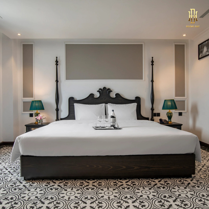 Phòng ngủ trong Thiết kế nội thất khách sạn Hoàng Đạt – TKKS001 mang phong cách tân cổ điển hiện đại, kết hợp hài hòa giữa sự sang trọng và cảm giác thư giãn. Chiếc giường gỗ chạm khắc tinh tế là điểm nhấn nổi bật, hòa cùng gam màu trung tính của tường và họa tiết gạch bông cổ điển trên nền nhà, tạo nên không gian ấm áp và thanh lịch.