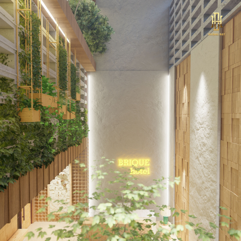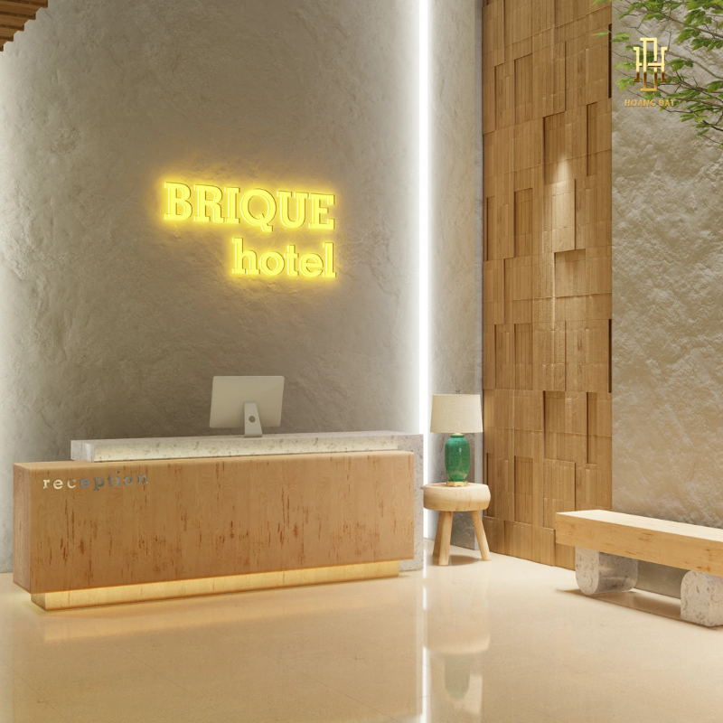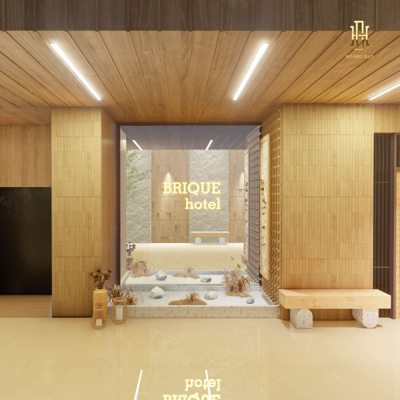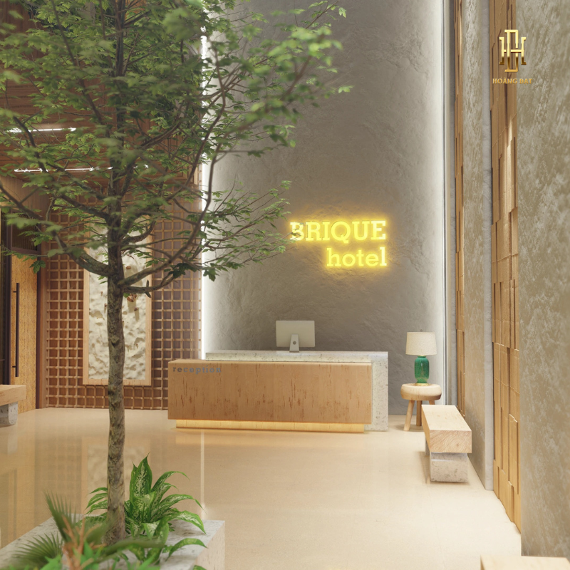 Sảnh trong Thiết kế nội thất khách sạn Hoàng Đạt – TKKS002 mang vẻ đẹp giản dị nhưng sang trọng theo tinh thần Wabi–Sabi. Tường xi măng xám mịn, sàn đá tự nhiên và quầy lễ tân gỗ nguyên bản tạo nên một không gian hòa quyện với thiên nhiên. Ánh sáng vàng nhẹ trải khắp sảnh, kết hợp cùng những món décor thô mộc như bình gốm, cây khô, bàn đá tự nhiên… mang đến cảm giác chậm rãi và thư thái.