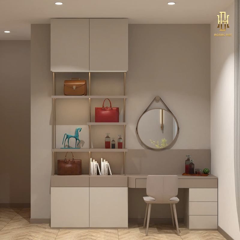 - Phòng ngủ chính: sử dụng gam màu be – xám chủ đạo, kết hợp giường bọc nệm, tủ quần áo âm tường và bàn trang điểm tròn tích hợp gương đèn LED.