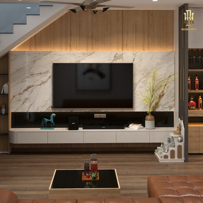- Khu vực phòng khách: kết hợp kệ tivi thông minh dưới gầm cầu thang – một giải pháp tận dụng không gian vô cùng hiệu quả.