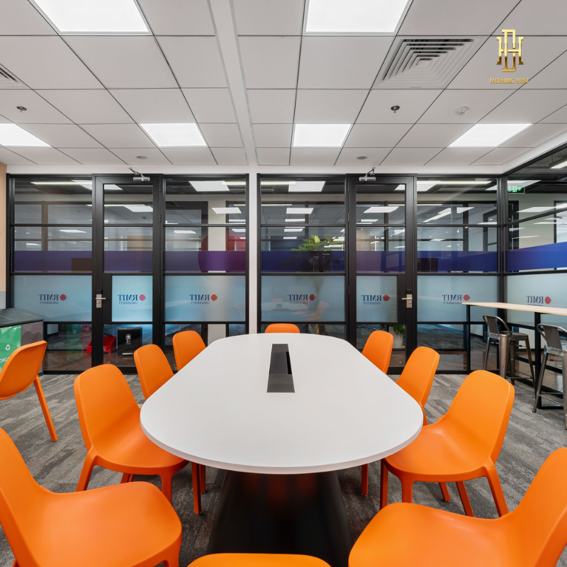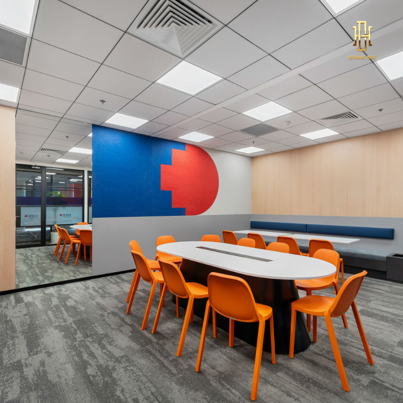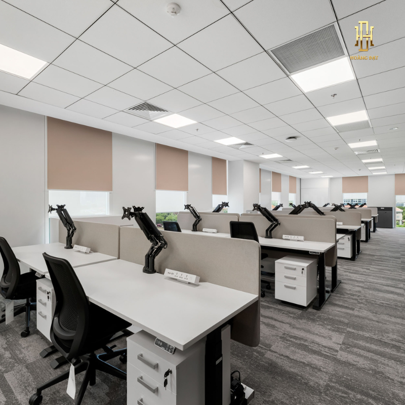 Gam màu trung tính phối hợp điểm nhấn xanh tạo cảm giác trẻ trung nhưng vẫn giữ được sự chuyên nghiệp. Nội thất công thái học được bố trí khoa học hỗ trợ nhân viên làm việc thoải mái, giảm áp lực và tăng tập trung. Khu vực lễ tân, phòng họp và bàn làm việc được thiết kế hiện đại, liền mạch, thể hiện tinh thần đổi mới và sự đầu tư nghiêm túc của doanh nghiệp Hoàng Đạt.