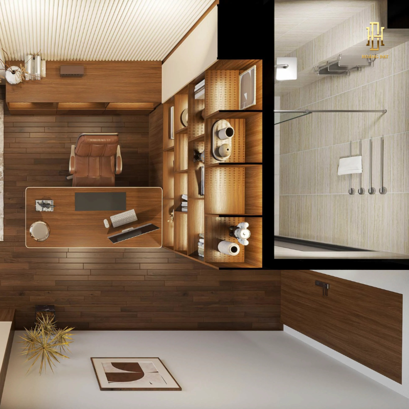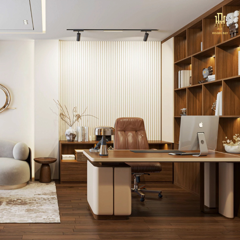 Thiết kế nội thất văn phòng Hoàng Đạt – TKVP004 được định hình theo phong cách sang trọng – tinh gọn, dành riêng cho không gian làm việc của Giám đốc. Tone nâu gỗ chủ đạo kết hợp ánh sáng ấm mang đến cảm giác uy quyền, điềm tĩnh nhưng vẫn hiện đại. Bố cục được tổ chức mạch lạc, tạo sự riêng tư cần thiết mà vẫn giữ được tính mở và sự thoải mái trong quá trình làm việc.