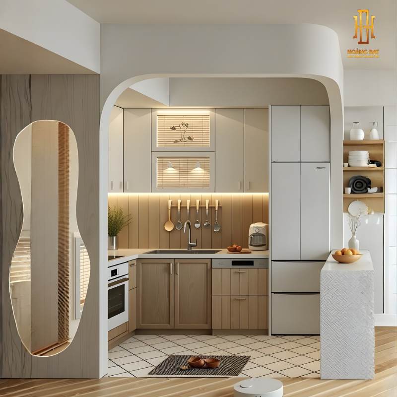 Tủ bếp gỗ hiện đại công nghiệp TBG014 mang phong cách hiện đại pha chút mềm mại, nổi bật với thiết kế vòm cong tinh tế. Bảng màu sáng ấm, phù hợp với các căn hộ và nhà phố yêu thích không gian bếp nhẹ nhàng, thân thiện nhưng vẫn có tính thẩm mỹ cao. Hệ thống chiếu sáng được bố trí hợp lý, kết hợp giữa ánh sáng tự nhiên và đèn trang trí, làm nổi bật vật liệu và các chi tiết thiết kế. Không gian bếp luôn giữ được sự thoáng đãng, tạo cảm giác dễ chịu trong suốt quá trình sử dụng.