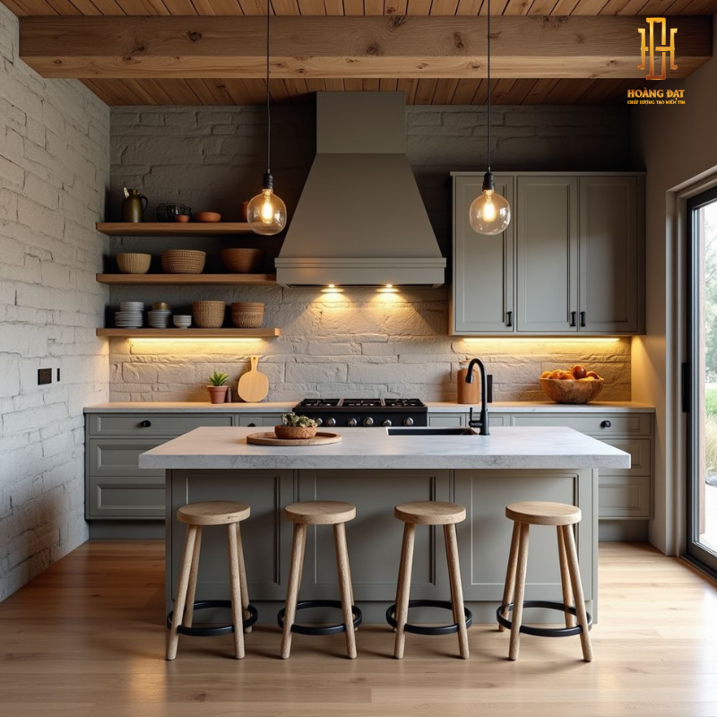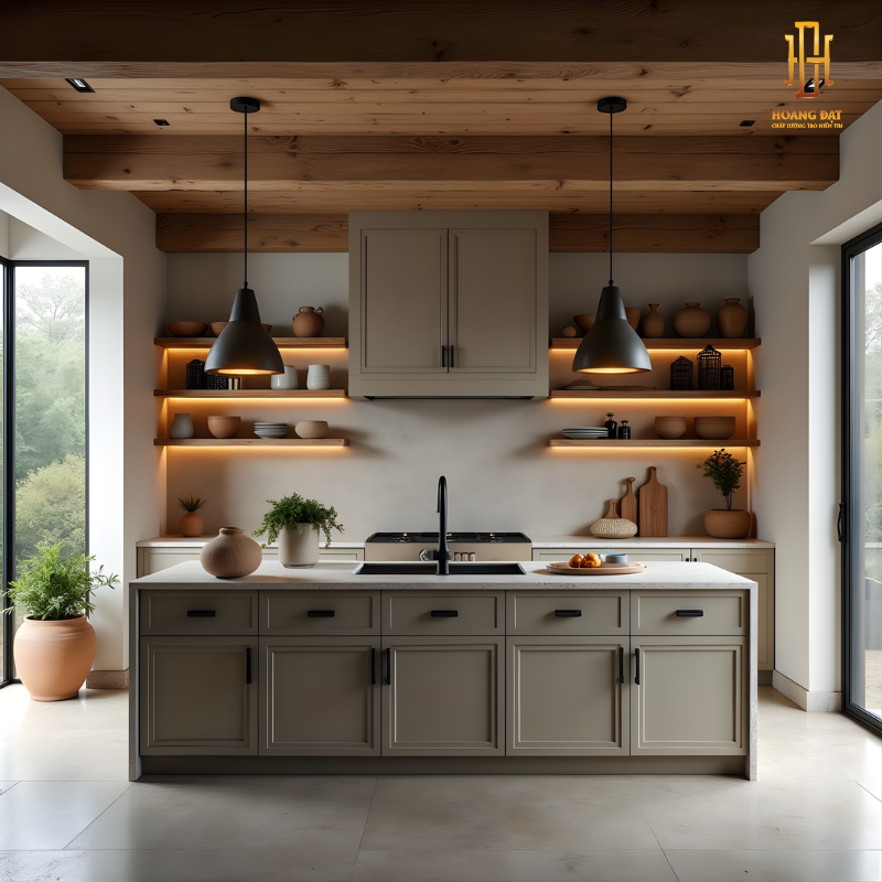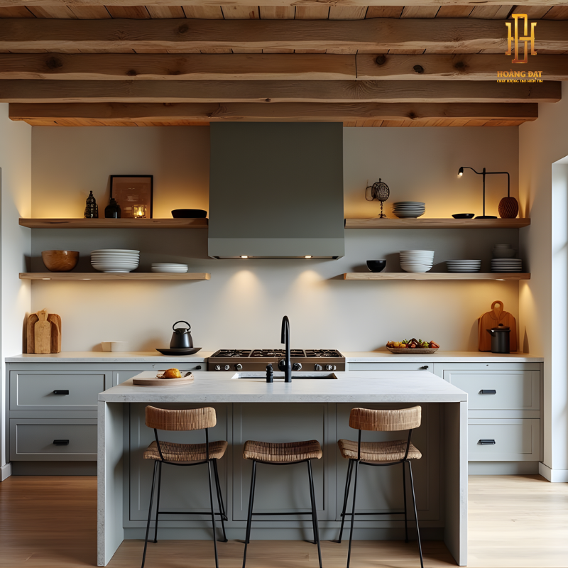 Thiết kế tủ bếp được bố trí khoa học với sự kết hợp giữa hệ tủ đóng và các kệ mở, vừa có thể lưu trữ gọn gàng, vừa tạo không gian trưng bày dụng cụ bếp hoặc vật dụng trang trí. Cách sắp xếp này giúp khu vực nấu nướng trở nên thông thoáng, thuận tiện trong quá trình sử dụng và tăng tính thẩm mỹ tổng thể.