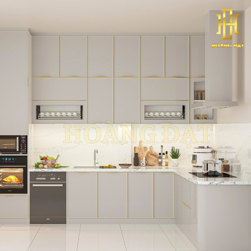 Tủ bếp hợp kim nhôm Hoàng Đạt - TBHK002 mang phong cách hiện đại tinh tế với gam màu trắng nhấn viền vàng sang trọng. Sản phẩm sử dụng khung hợp kim nhôm chắc chắn, chống ẩm mốc, chống mối mọt và bền bỉ theo thời gian. Cánh kính cường lực khung nhôm sáng bóng giúp không gian bếp trở nên rộng rãi, đẳng cấp và dễ dàng vệ sinh. Thiết kế thông minh với hệ phụ kiện mở trượt tiện lợi, tối ưu công năng sử dụng – lựa chọn hoàn hảo cho căn bếp hiện đại, sang trọng và bền đẹp theo năm tháng.
