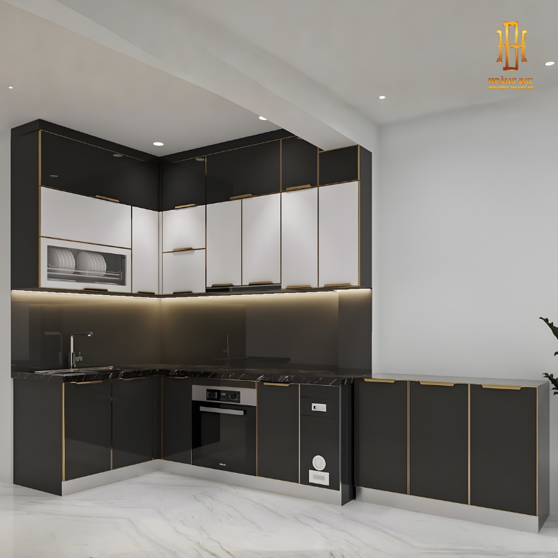 Tủ bếp hợp kim nhôm Hoàng Đạt - TBHK010 được thiết kế theo phong cách hiện đại, chú trọng sự gọn gàng và tính ứng dụng cao. Bố cục chữ L giúp tận dụng tối đa diện tích, tạo không gian nấu nướng thuận tiện và khoa học cho gia đình. Sản phẩm sử dụng hợp kim nhôm cao cấp, có khả năng chống nước tuyệt đối, không bị cong vênh hay mối mọt trong quá trình sử dụng. Với đặc tính bền bỉ, tủ bếp phù hợp với điều kiện khí hậu nóng ẩm, đảm bảo tuổi thọ lâu dài theo thời gian.