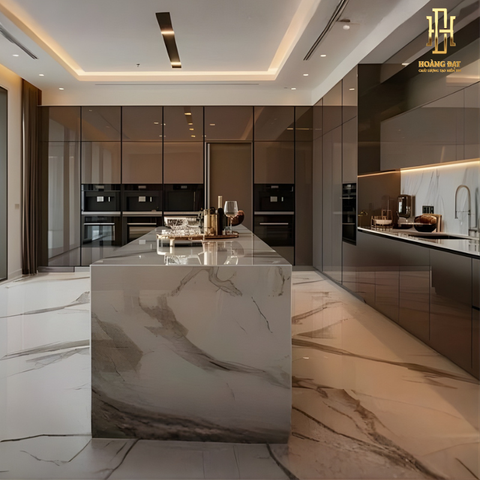 Tủ bếp hợp kim nhôm Hoàng Đạt – TBHK014 được bố trí theo dạng chữ L kết hợp đảo bếp, phù hợp với không gian bếp rộng và thoáng. Cách sắp xếp này tạo lối di chuyển linh hoạt, các khu vực nấu nướng được kết nối gọn gàng và dễ sử dụng hằng ngày. Tông màu nâu xám trầm mang lại cảm giác sang và sạch. Bề mặt phẳng, ít chi tiết rườm rà nên nhìn rất hiện đại. Đảo bếp đặt ở trung tâm, vừa tăng diện tích thao tác, vừa có thể dùng làm bàn soạn đồ hoặc bữa ăn nhanh.