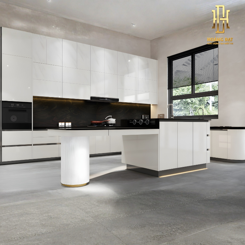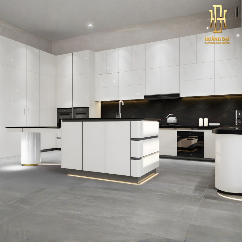 Hệ tủ trên được thiết kế kịch trần nhằm khai thác tối đa chiều cao không gian. Cánh tủ phẳng, liền mạch, tạo cảm giác gọn gàng và sang trọng. Đảo bếp đặt độc lập ở trung tâm, tích hợp chậu rửa và khoang chứa phía dưới. Các góc bo cong nhẹ giúp tổng thể mềm mại và an toàn khi sử dụng.