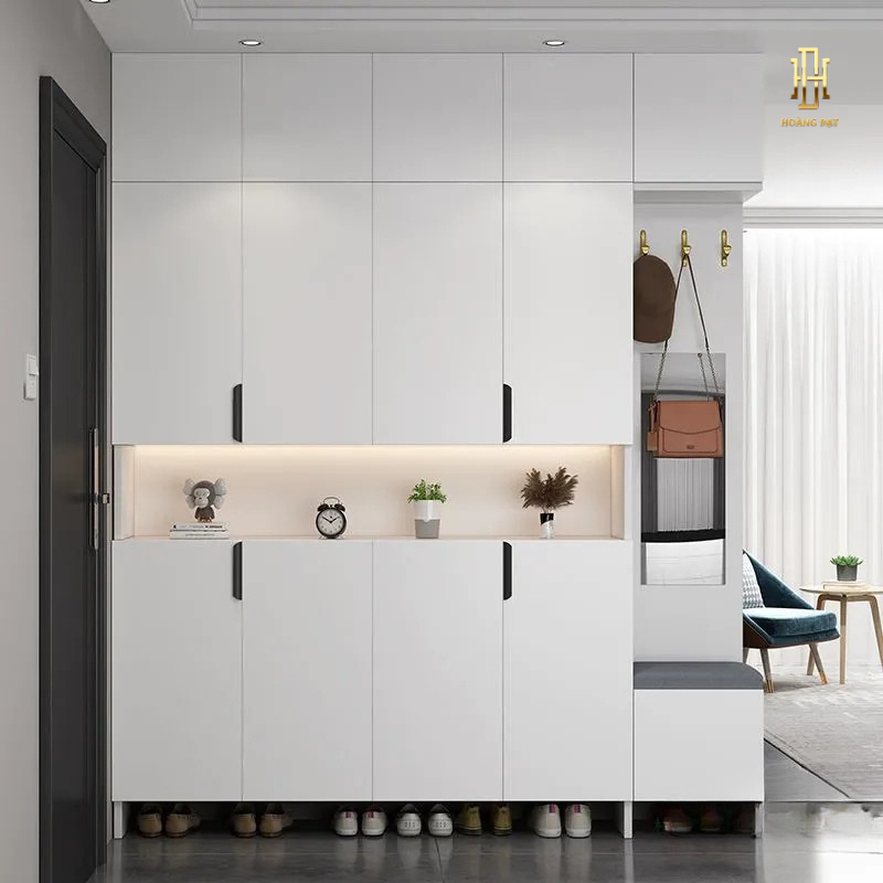 Tủ giúp lưu trữ giày dép gọn gàng, phân chia ngăn khoa học, đồng thời bảo vệ giày khỏi bụi bẩn và ẩm mốc. Hệ thống đèn LED trang trí tinh tế không chỉ giúp dễ dàng tìm kiếm mà còn tăng giá trị thẩm mỹ cho căn nhà.