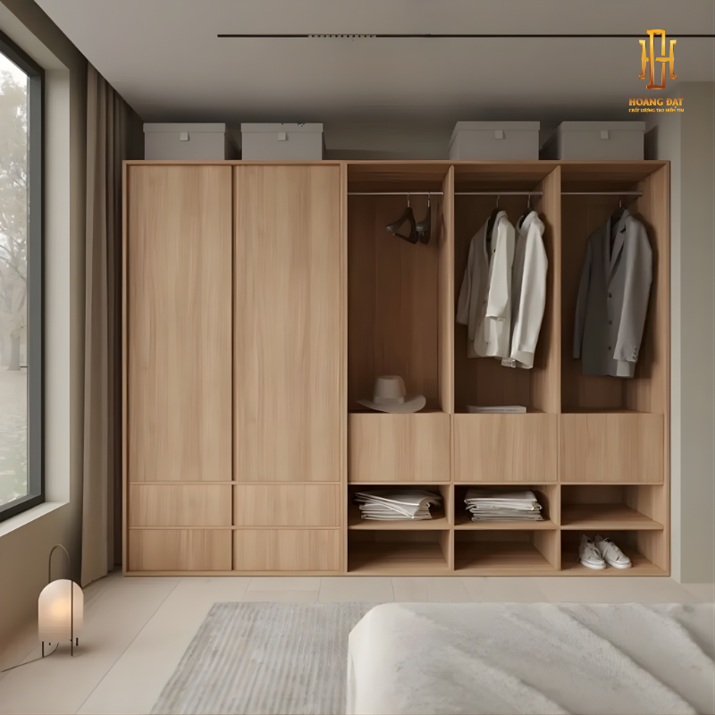 - Khoang mở thông minh gồm cách khu vực: thanh treo áo dài, vest, ngăn để mũ và túi xách, hệ ngăn kéo trượt êm ái, ô để đồ gấp và kệ để giày.