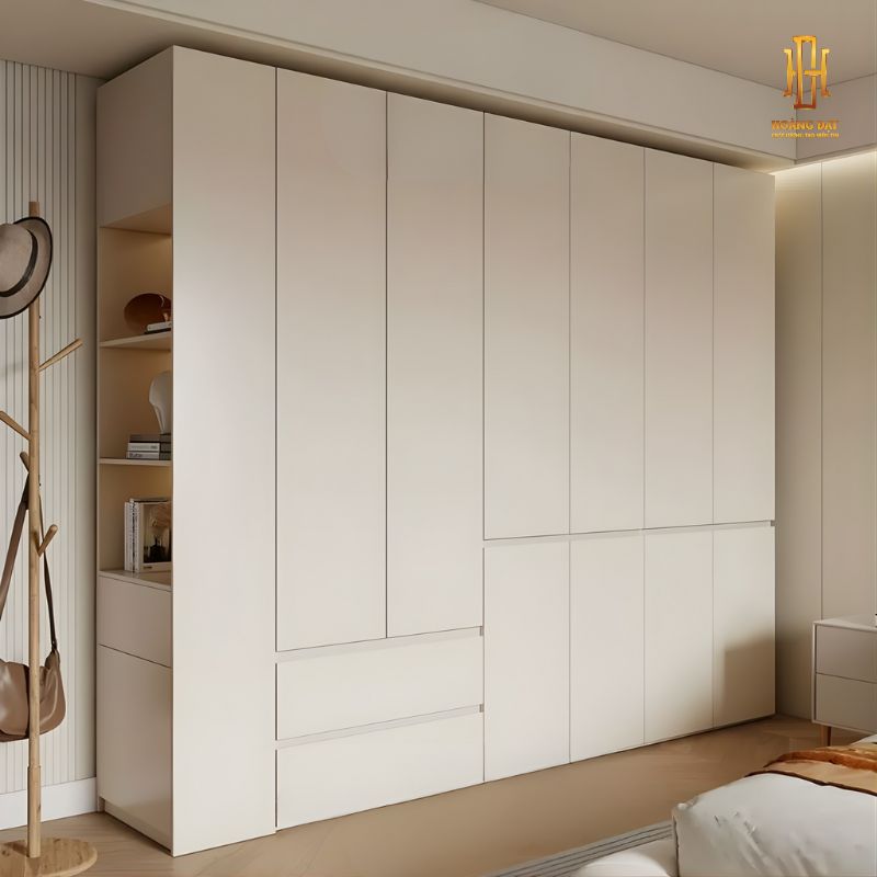 Tủ quần áo gỗ công nghiệp Hoàng Đạt - TQA017 được thiết kế theo phong cách hiện đại tối giản, tập trung vào sự gọn gàng, tinh tế và khả năng lưu trữ hiệu quả. Gam màu trung tính nhẹ nhàng kết hợp bề mặt phẳng, đường nét thẳng tạo cảm giác không gian phòng ngủ rộng rãi, sáng sủa và dễ phối với nhiều phong cách nội thất khác nhau.