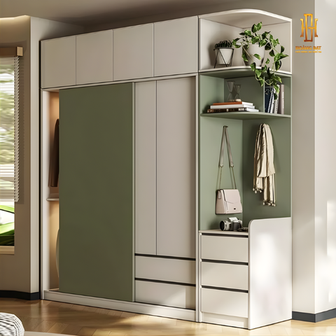 Sản phẩm sử dụng hệ cánh trượt giúp tiết kiệm diện tích khi đóng mở. Đặc biệt phù hợp với mọi không gian nhờ sự linh hoạt của Hoàng Đạt có thể thiết kế và lên bản vẽ 2D, 3D theo kích thước thực tế của gia chủ. Kết hợp cùng hệ kệ mở và hộc trang trí bên hông, tủ không chỉ đáp ứng nhu cầu lưu trữ mà còn tạo điểm nhấn thẩm mỹ, thuận tiện để trưng bày túi xách, phụ kiện hoặc đồ decor.