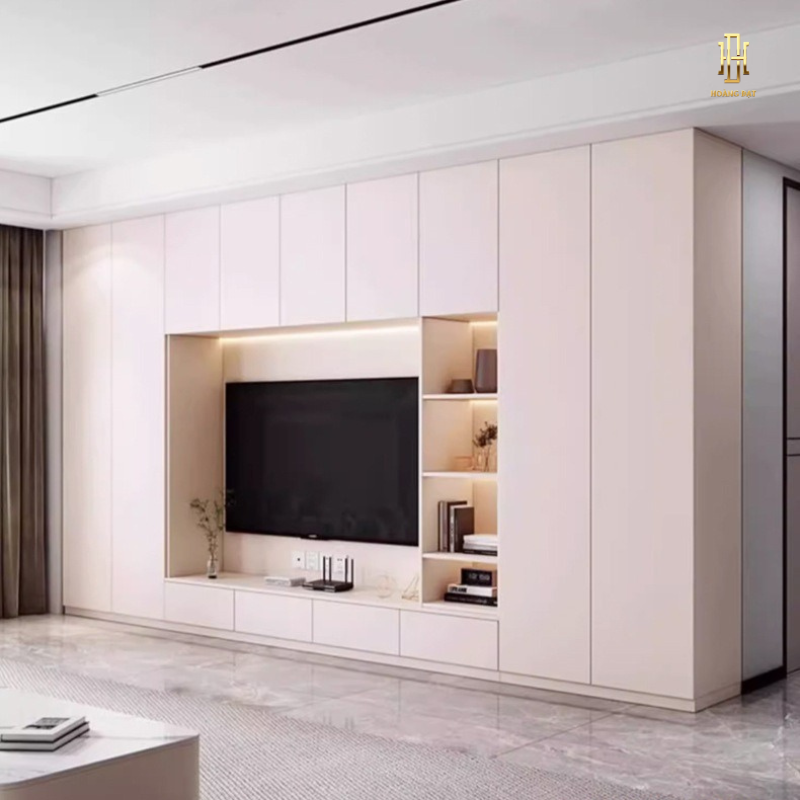 Tủ tivi không chỉ là nơi đặt màn hình giải trí mà còn giúp lưu trữ, trưng bày rượu, sách hay vật dụng trang trí, mang lại sự gọn gàng và tính thẩm mỹ cao cho căn phòng.